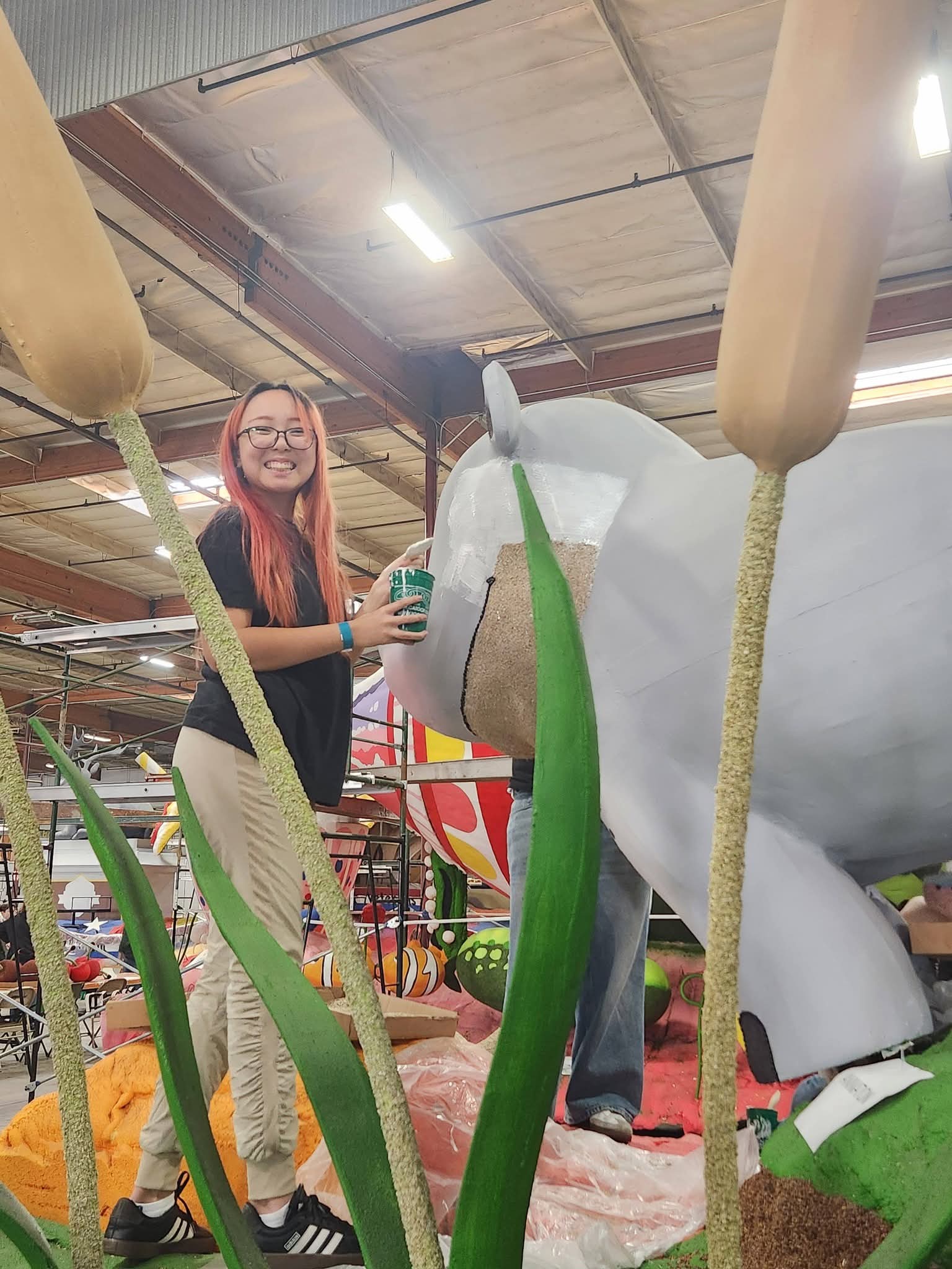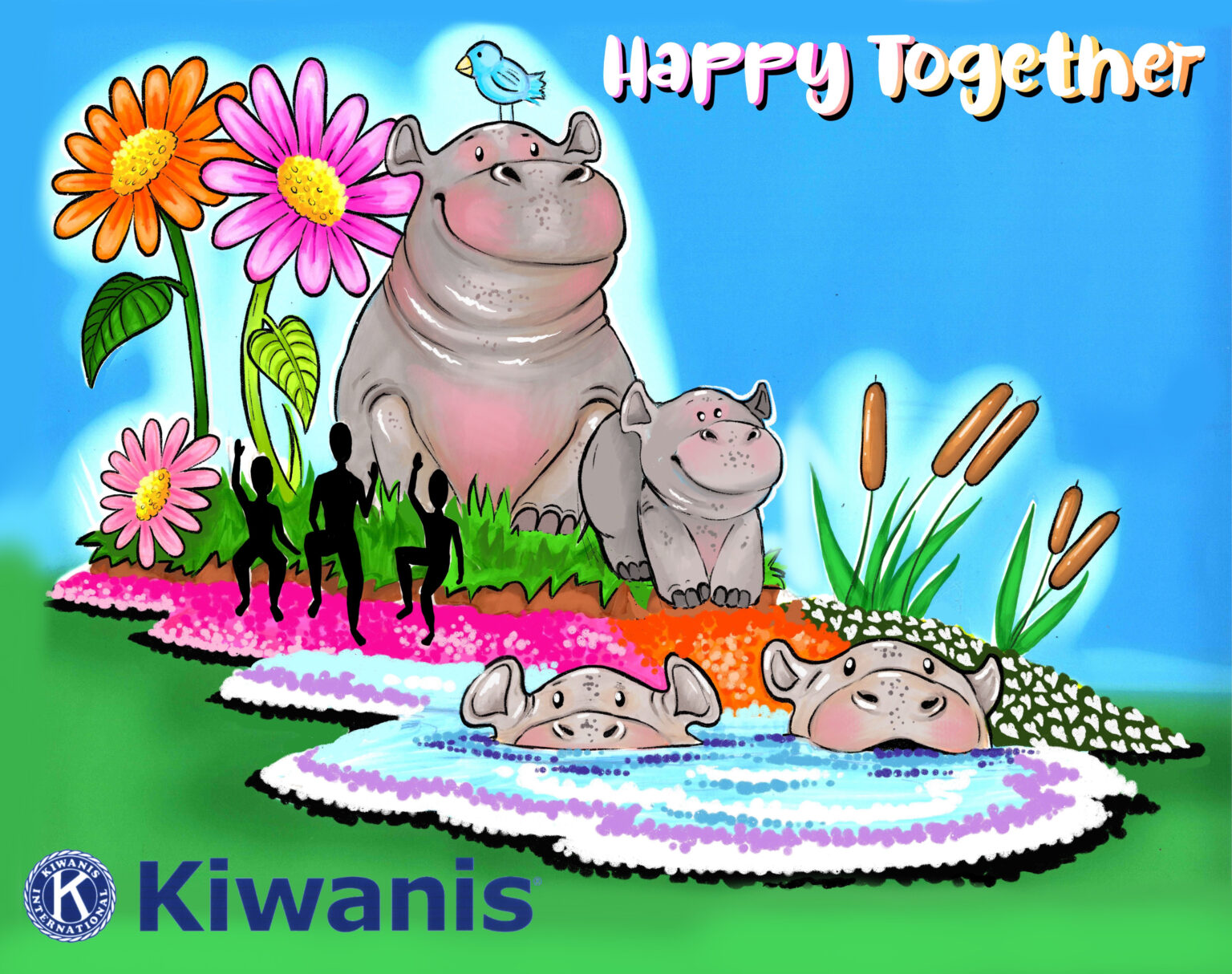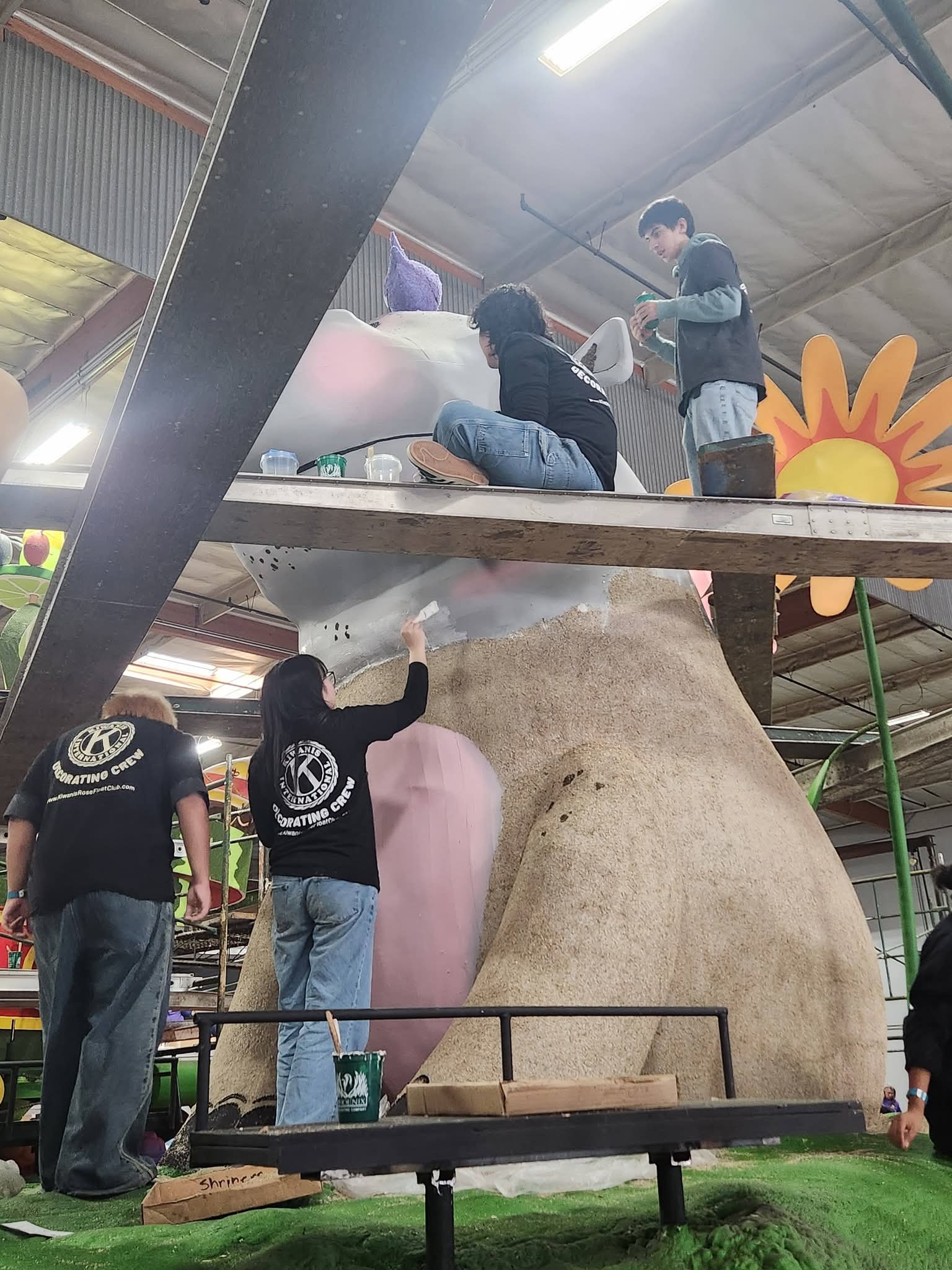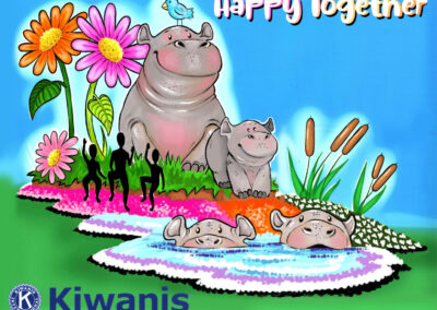Our 2026 float is a hippo-themed design called “Happy Together.” (The theme of the Rose Parade itself is “The Magic of Teamwork.”) Built by the Phoenix Decorating Company, the float is being decorated by hundreds of volunteers — including many from throughout the Kiwanis family — to get it ready for the January 1 event.